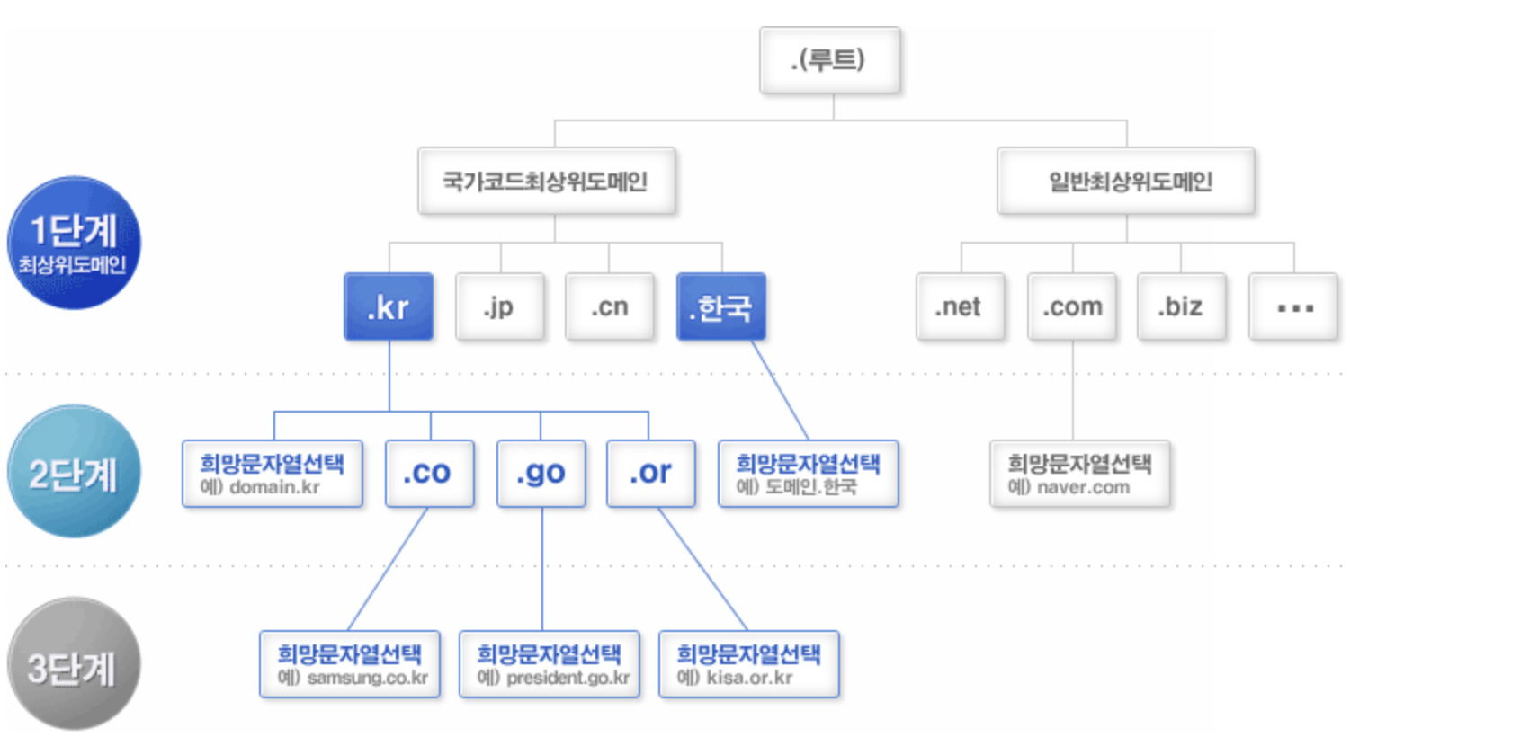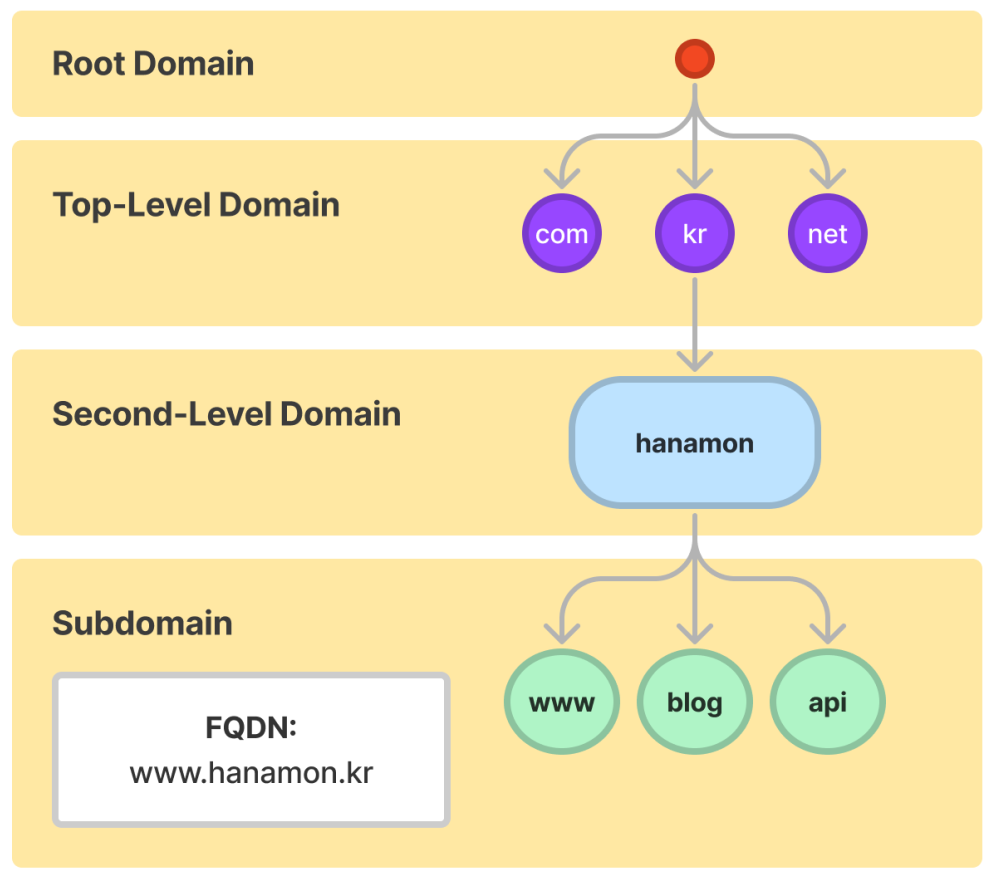 - 최상위 도메인은 도메인 이름의 가장 높은 수준을 나타냅니다. ".com", ".org" 같은 상용 TLD와 ".us", ".kr" 같은 국가 코드 TLD가 있습니다.