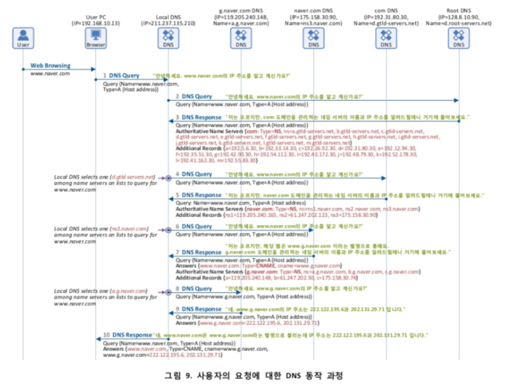 만약 Local DNS에 접속정보가 캐싱되어 있다면, 해당 DNS 서버로부터 IP주소를 바로 받을 수 있다. (2번부터 7번 과정 생략, 바로 8번으로 직행한다는 의미)